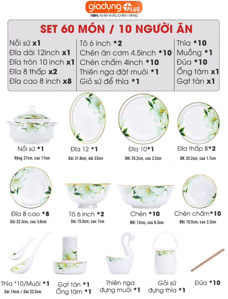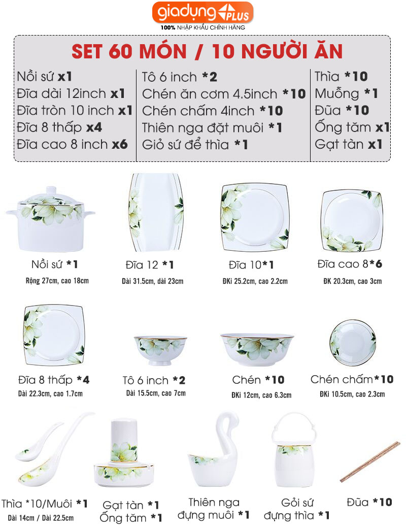 C. Hãng Bộ chén bát sứ BÁCH HỢP (Lily Flowers) cao cấp nhập khẩu - Set 10 người ăn gồm chén, bát, đĩa, tô, nồi, muỗng, đũa..