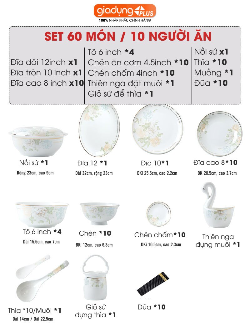 C. Hãng Bộ chén bát sứ HOA MỘNG ẢO (Mona Lavender) cao cấp nhập khẩu - Set 10 người ăn gồm chén, bát, đĩa, tô, nồi, muỗng, đũa..