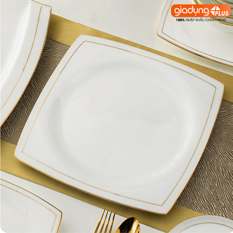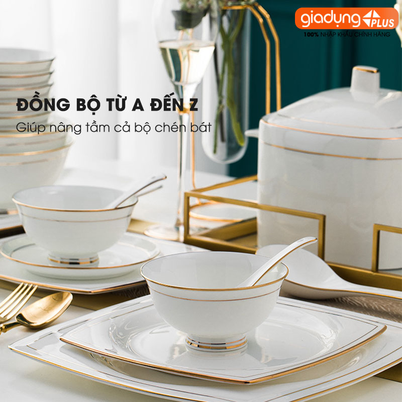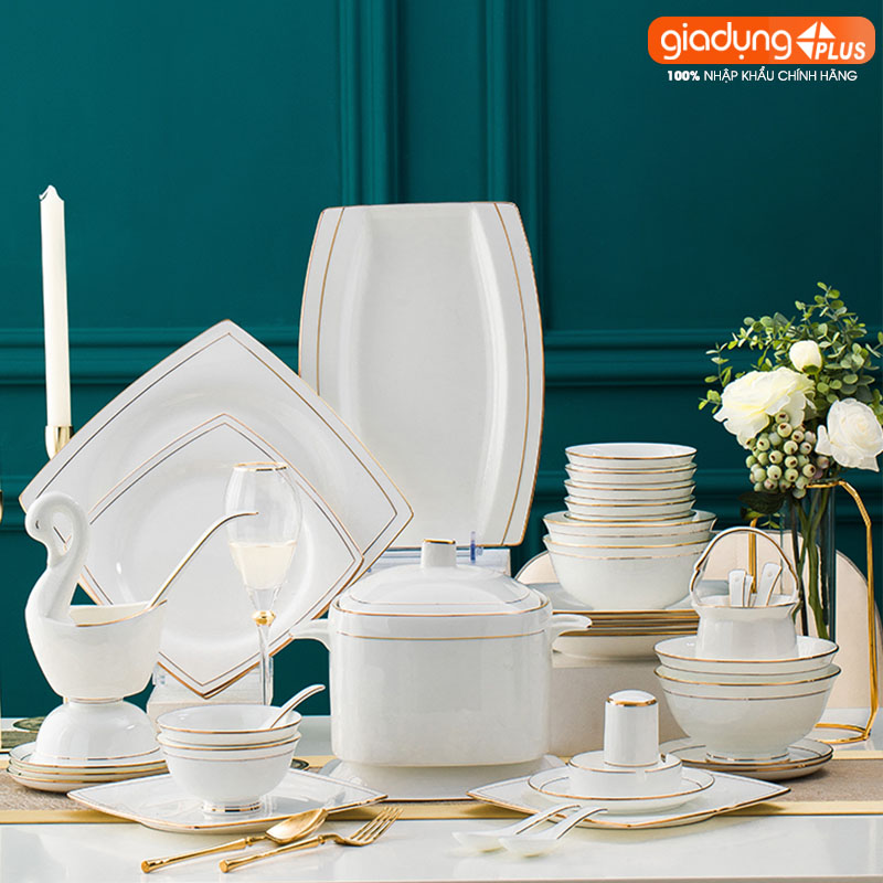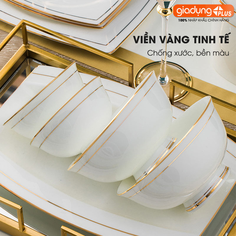 • Bộ chén ăn sứ cao cấp cho 10 người ăn vô cùng sang trọng, tinh tế với màu trắng tinh tế được viền vàng bao quanh sang trọng.