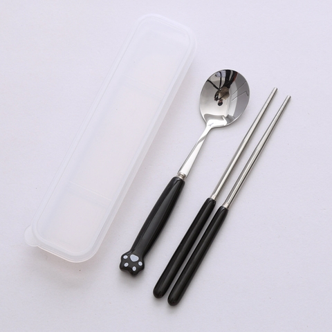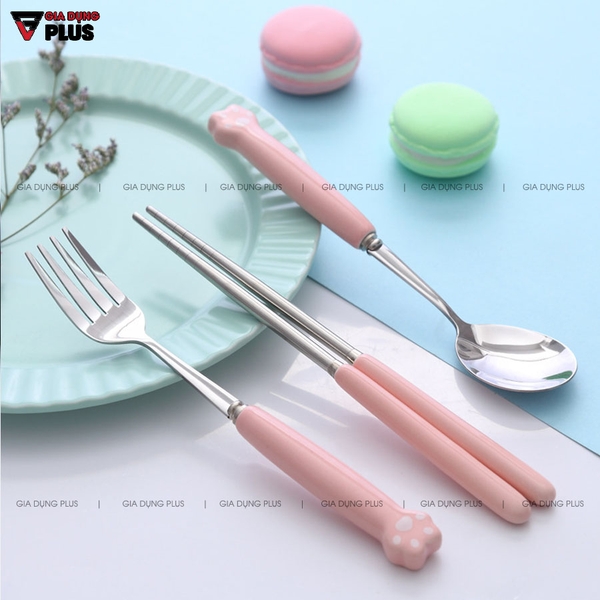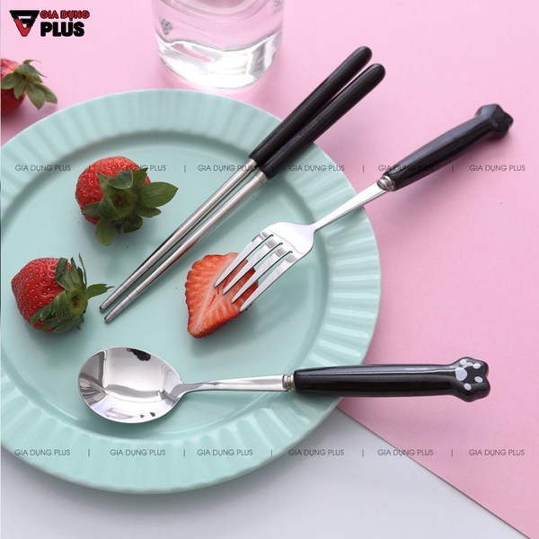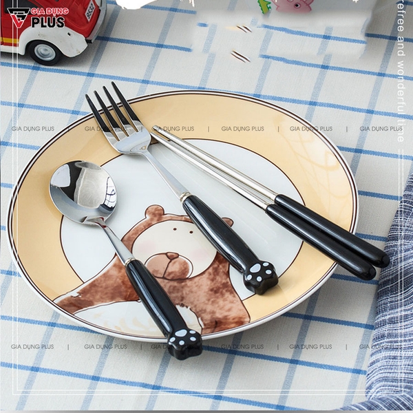 Bộ Đồ Ăn Cá Nhân Gồm Đũa / Muỗng / Nĩa Cao Cấp Tay Cầm Sứ Hình Chân Mèo Dễ Thương | Qianhuiju