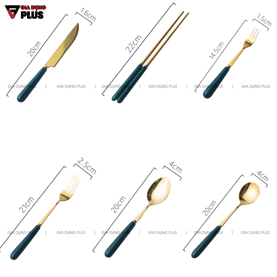 Kích thước của bộ sản phẩm | Đũa dao nĩa thìa muỗng inox 304, tay cầm sứ cao cấp Qianhuiju