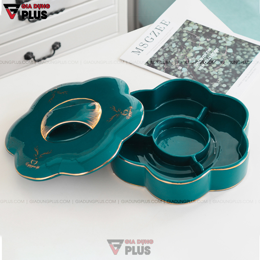 Hộp đựng kẹo mứt sứ bông hoa, màu xanh ngọc lục bảo sang trọng | Được chia làm 4 ngăn, 3 ngăn tam giác và 1 ngăn tròn ở giữa